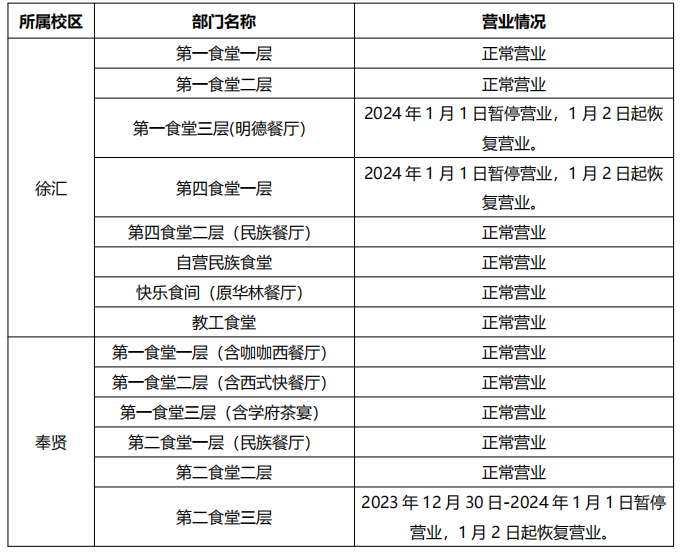 根據《關于2023-2024 學年寒假及2024年部分節假日放假安排的通知》(校辦發〔2023〕2號)的精神,現對后勤保障處2024年元旦期間班車和對外窗口服務時間安排如下。