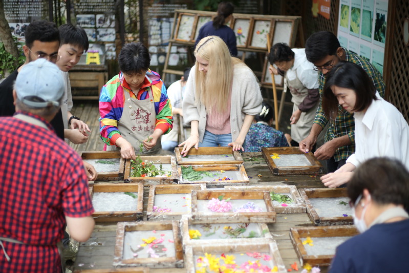 留學生在華東理工大學國際學生文化實踐基地體驗古法造紙